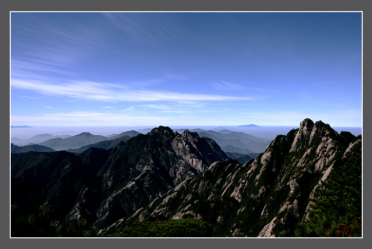 如黄山,有四个特点:云海、云雾、奇松、怪石。但是我们把视野放到大处,便有各具奇景,各具奇险的三十六大峰和三十六小峰;若把视界略放,更有不少郁郁苍苍的茂林、清幽深还的岩谷。再把视线带回身边,便有许多自由自在的小景,这一切的一切,都是以令人心醉神迷。