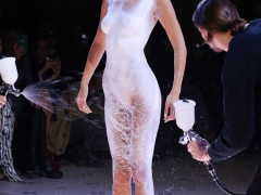 巴黎时装周 Coperni 秀场上 Bella Hadid 现场被喷漆并剪裁长裙